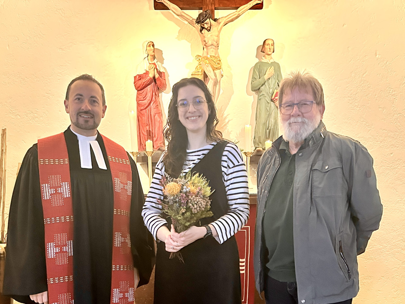 Im Gottesdienst am heutigen Sonntag wurde sie der Gemeinde vorgestellt und für ihren Dienst gesegnet. Vertrauensmann Ulrich Gerlach dankte in seinem Grußwort für die Bereitschaft für unsere Kirche zu arbeiten. Auch Vertrauensfrau Jasmin Mittag hieß sie willkommen.